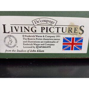 This charming Beatrix Potter decoupage artwork from 1991 captures nostalgic scenes of beloved characters. With intricate details and a wooden frame, it embodies a timeless vintage aesthetic. Crafted in the UK and licensed by Frederick Warne & Co., it serves as a delightful addition to any collector's display.