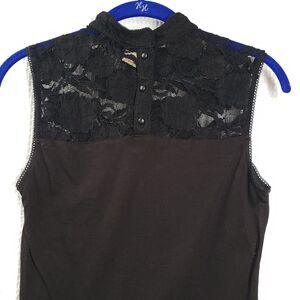 Beau Bois Women's Sleeveless Lace Top. This black goth mockneck top has lace details and a round hem. It is a vintage from the 2000s.
