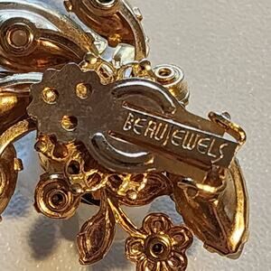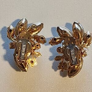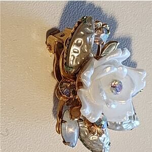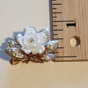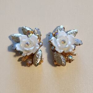 Beautiful vintage Beau Jewels earrings. White flower center with gold and pearlized leaves. Clip on closure. Rhinestone details.