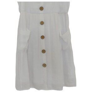 This charming off-shoulder dress features a graceful white hue, complemented by a row of rustic wooden buttons down the front. The dress boasts two convenient pockets for added functionality, and its delicate ruffled neckline adds a touch of romantic flair. Made from lightweight fabric, it is both stylish and comfortable, making it ideal for warm weather.