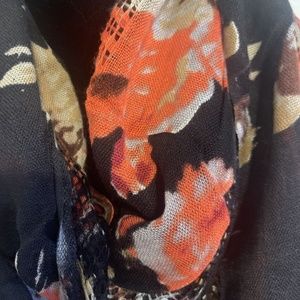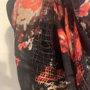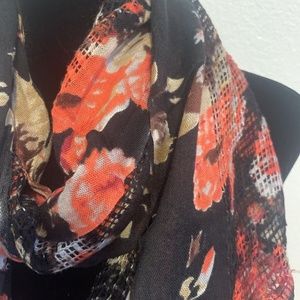 This beautiful scarf is a stunning black with a red & tan floral print. It is about 66" in total length (if it was not stitched closed) and about 27" in width. It has been professionally cleaned. Piece is free of stains, rips, holes, tears. It does have creases that need to be ironed or steamed out from being in storage. It has been in storage in a non-smoking home. If you have any questions please message me. PLEASE REVIEW PICTURES.