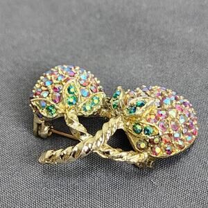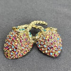 Vintage Beautiful Dual Strawberries Gold Plated Iridescent Rhinestone Brooch Pin