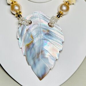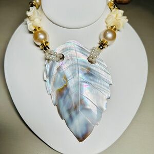 Vintage Beautiful Mother of Pearl Carved Leaf pendant necklace is in great vintage condition and kept in a clean smoke free home. 21" long, and 4" X 2.75” pendant