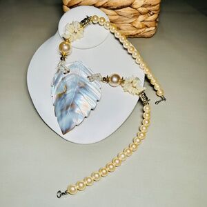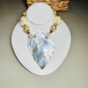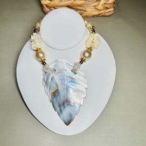 Vintage Beautiful Mother of Pearl Carved Leaf pendant necklace