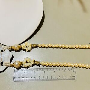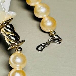 Single strand necklace is made of mother of pearl pieces, cream champagne colored faux pearls, with gold plated accents. The gold beads show minor signs of aging, which I feel adds to the vintage look of this gorgeous piece.