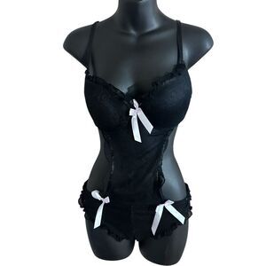 Vintage Beautiful Y2K 2000s deadstock black Lacey with with adjustable straps and floral details and ribbon bows Size large Black