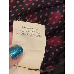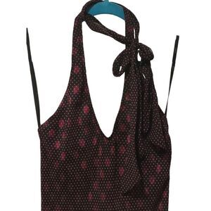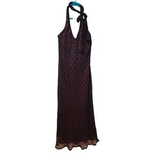 This stunning vintage Bebe Silk Annalisa Halter Slip Dress in size L is perfect for any occasion. The dress features a beautiful Polka-dot pattern in black and fuchsia, with a sleeveless design and a strapless halter neckline. The dress is made from high-quality chiffon fabric and is lined for added comfort.