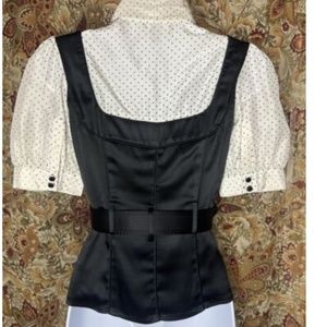 Vintage Bebe Silk Black & Polkadot Button Up Blouse w/Belt Pinup Burlesque Retro