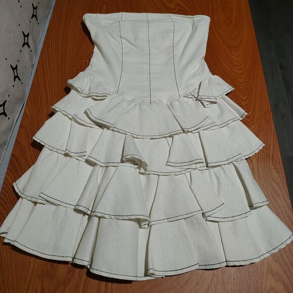 The dress features a fitted, strapless bodice with vertical seam details and multiple horizontal layers of ruffles on the skirt, each with dark contrasting stitching along the edges.