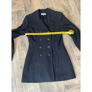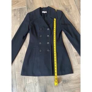 Vintage Bebe Women’s Double Breasted Black Jacket in size 4. Super stylish. GUC. Measurements: length: 29, chest: 16, wrist: 14.5, hem: 18, upper arm: 6, and shoulder to sleeve: 24.5”. Made in the USA. Silver hardware on the back.