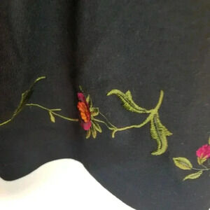 Vintage Bechamel 1990s black embroidered cardigan. Beautiful roses embroidered to button down front and bottom of sleeves. Shoulder pads and double stitching to neck, bottom of sleeves, and bottom of cardigan. 100% cotton. Pit to pit 25" and length 25.5". Excellent condition. Ships same or next day.
