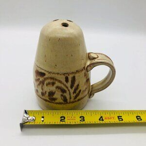 Vintage Becky Eiker studio pottery ceramic cheese shaker with cork stopper. Applied handle. Features a plant design consistent with other Eiker pieces. Artist stamp is on the bottom.