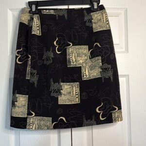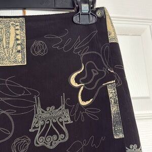 This elegant black skirt features a unique pattern, perfect for adding a touch of sophistication to your wardrobe. Lined wrap skirt, 100% polyester.