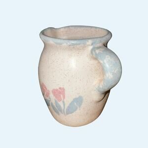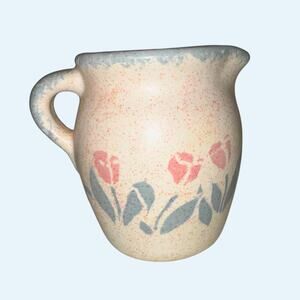 This charming vintage ceramic pitcher features a speckled beige glaze and hand-painted tulip motif in rose and blue. Its petite size makes it perfect for cream, syrup, or a few small flowers on your table.