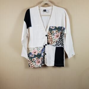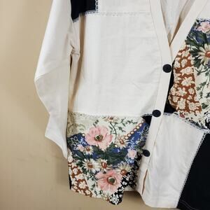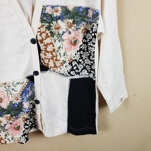 Has staining on the back. Please see photos. Size large petite. Long sleeve button front cardigan with a patchwork design. V-neck.
