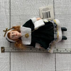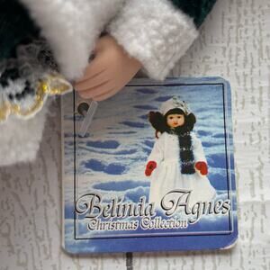 Vintage Belinda Agnes Christmas Collection Doll. Red headed porcelain doll in a green holiday dress with a crossbody purse. Please see pictures for details and measurements.
