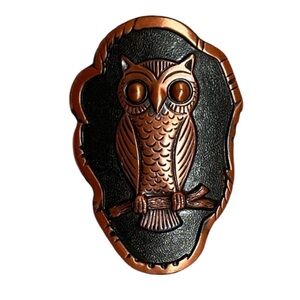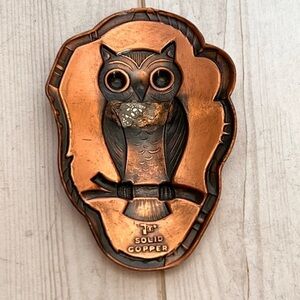 Large copper owl pendant/medallion has a lovely shape and details. Stamped on back with “Solid Copper” and the Bell Trading Post mark.