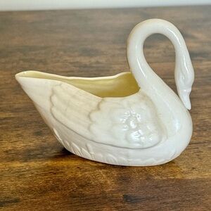 This beautiful vintage swan creamer was crafted by Belleek Pottery in County Fermanagh, Ireland, between 1946 and 1955. Made from Belleek’s signature Parian china, the piece has a delicate, eggshell-like finish with a creamy ivory glaze and a subtle yellow interior. The graceful swan shape makes it as charming as it is functional.