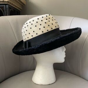 Vintage Bellini New York Hat. Doeskin felt, black faux fur on bottom of hat, white faux fur on top part of hat with black beads. Black ribbon surrounds hat with bow in back of hat. EUC.