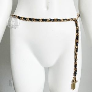 Preowned, vintage gold chain and navy blue leather belt, made by Morris Moskowitz, most likely in the 80s. Iconic style that can be worn as a belt or necklace! Preowned/vintage with some signs of use and prior wear: some discoloration to the gold metal portions; some light rubs to the leather from use. No size tag, but measures approximately 38in end to end (including hook fasteners) and best fits a waist between 27in and 33in. Stamped MM (Morris Moskowitz logo).