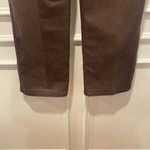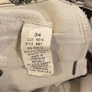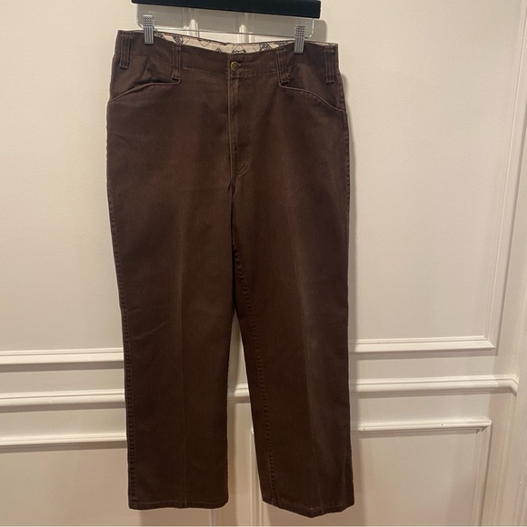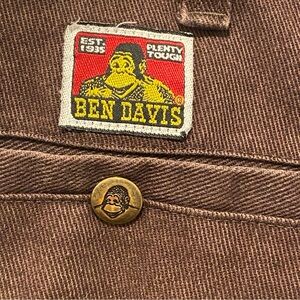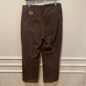 Vintage Ben Davis workwear pants in size 34. Classic brown color with iconic gorilla logo patch on back pocket. Made from durable 50% polyester/50% cotton blend. Traditional work pant styling with front slant pockets, back welt pockets with button closure, and belt loops. Heavy-duty construction built to last. Pre-owned with vintage wear consistent with age.