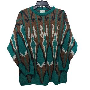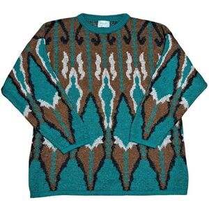 Vintage Benetton Mohair Blend Patterned Retro Y2K Boho Sweater Teal/Brown Size 46 XXL