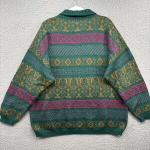 Color/Pattern: Green base with pink/magenta, mustard/gold, and gray geometric Fair Isle jacquard