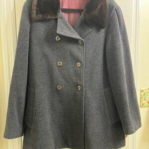 Vintage Benetton Wool Coat w/ Faux Fur Collar — Double Breasted Gray