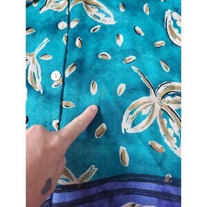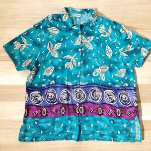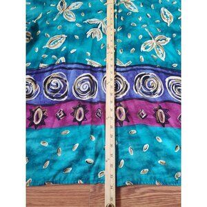 A vibrant vintage Bentley Woman Top in size 3X, featuring Mother of Pearl buttons and side slits. The top is adorned with a unique blend of floral and geometric patterns, cast in appealing shades of teal, magenta, and purple.