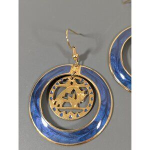 Vintage Berebi Western Buffalo Blue Enamel Gold Tone Round Hoop Dangle Earrings
