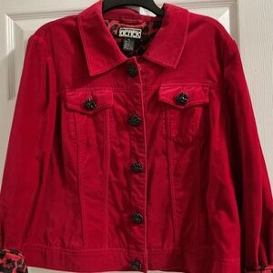 Stunning and unique vintage red velvet jacket with oversized rhinestone snap closure buttons and leopard print accents. This would be gorgeous dressed up or down for all of your holiday activities and beyond. Women’s XL.