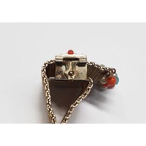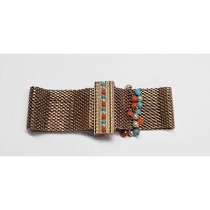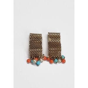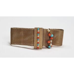 This is a vintage gold tone mesh style bracelet and earrings set by Bergere. The unsigned bracelet features small plastic beads in faux pearl, light blue and a coral color. The plating is in nice condition and there are no missing beads. The bracelet measures 8"l., but is adjustable due to the clasp type.