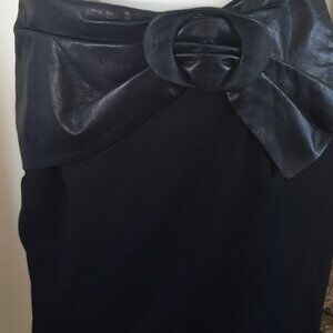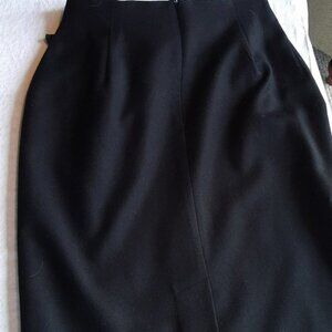Wool skirt with leather belt. Zipper in back. Pleat at bottom back of skirt. Fabulous design! app 13 inches at waist lying flat. 25 inches long.