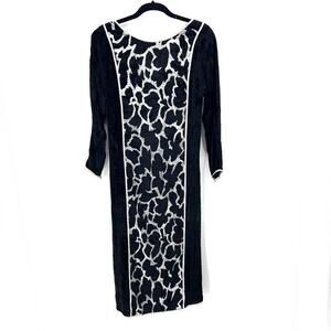 Dress feels like a crushed velvet, with a metallic silver detail. Pullover pencil dress style with zippers at the wrist. One side slit. Dress has a partial lining which feels like silk. Jacket is reversible with the same pattern as dress on one side & solid black on the inside with silver trim. Large faux diamond buttons on the inner & outer side. It has striped stitching detail throughout, which gives it a quilted feel. There is only one tag attached labeled (front) to determine which way to wear dress. The back of the dress has a scooped neckline.