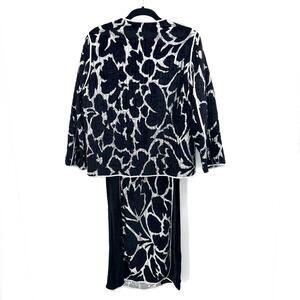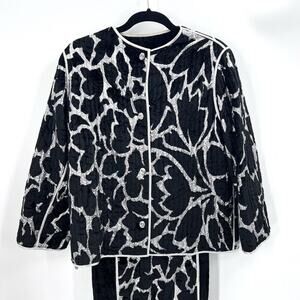 Dress feels like a crushed velvet, with a metallic silver detail. Pullover pencil dress style with zippers at the wrist. One side slit. Dress has a partial lining which feels like silk. Jacket is reversible with the same pattern as dress on one side & solid black on the inside with silver trim. Large faux diamond buttons on the inner & outer side. It has striped stitching detail throughout, which gives it a quilted feel. There is only one tag attached labeled (front) to determine which way to wear dress. The back of the dress has a scooped neckline.