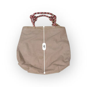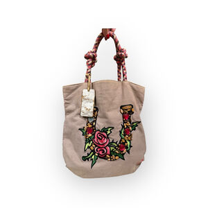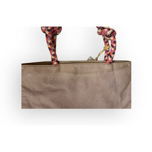 This is a pre-owned Betsey Johnson Betseyville tote bag. It is approximately 16 inches in height and 15 inches in width, with a base of 3 inches. The bag is made of a Tan Khaki canvas material with braided multicolored leather handles. It features a floral embroidered design in the shape of a 'U' on the front. There are jewels and beads sewn over the U shape. There are visible a few stains on the canvas.There are a couple small ink spots, some light stains but they aren’t extremely noticeable, there’s a yellow discoloration on the backside along the top. It’s appears to be from getting wet or wash it. The beads and jewels appear intact. I can’t guarantee that all the beads are there. Please check out the pics to have an accurate idea of the imperfections