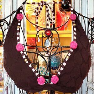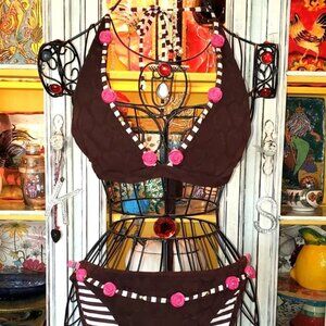 Vintage Betsey Johnson Y2K Brown Hearts and Pink Carved Roses 2 pc Bikini Bathing Suit