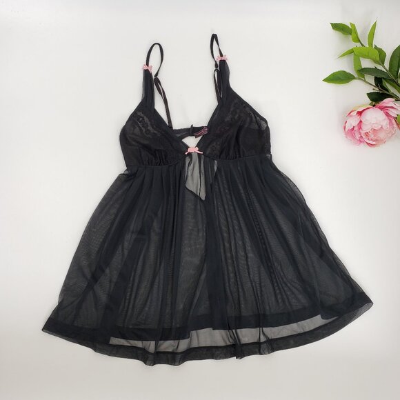 Vintage Betsey Johnson Intimates Babydoll Negligee Size S Black Sheer Pink Bows