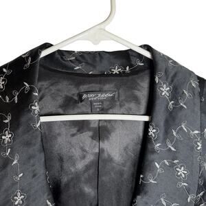 Features black silk fabric with dainty floral embroidery, a beaded/embroidered trim on waistline, lapel collar, slightly cropped length