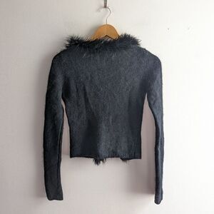 Vintage Betsey Johnson black angora rabbit hair feather trim cardigan sweater