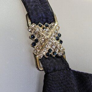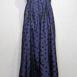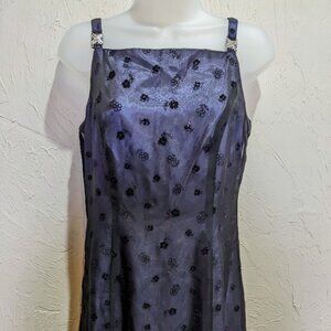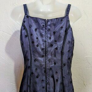 FEATURES/ACCENTS: Hight square Neck with rhinestone embellishments on straps. Polyester black sheer mesh overlay with indigo (slightly midnight blue/purple) acetate lining. Sleeveless, spaghetti straps, slight A-line skirt, princess cut bodice. Black Floral daisy print with glitter details. Back zip.