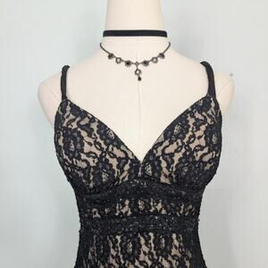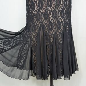 Vintage prom dress midi lace illusion gown from Betsy & Adam, size 8. Black sheer floral lace over tan lining. Empire waist with sequin details. Skirt with mesh godet panels. Ideal for Gatsby / flapper, fairy goth, whimsigoth, 90s, glam, classic , and Y2K vibes.