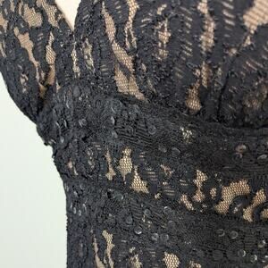 Vintage prom dress midi lace illusion gown from Betsy & Adam, size 8. Black sheer floral lace over tan lining. Empire waist with sequin details. Skirt with mesh godet panels. Ideal for Gatsby / flapper, fairy goth, whimsigoth, 90s, glam, classic , and Y2K vibes.