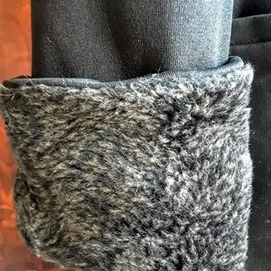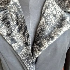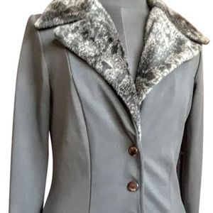 Great formfitting black jacket with faux fur collar and cuffs, has some stretch to it, very versatile. likely from the late 1990s when her "New York" label was popula