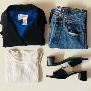 The cutest vintage black blazer with a pinstripe and buttons down the front. Perfect for the office, but would also look great worn casually with a blue or black pair of straight leg jeans and a cute black heel or booties. Approximate measurements shown in photos. In excellent condition! Feel free to ask questions or make an offer!