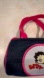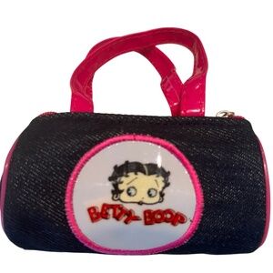 Vintage Betty Boop mini barrel bag featuring dark denim, hot pink patent handles, and the iconic blue-eyed face. Compact and full of personality.