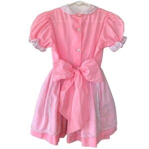 Vintage Betty Oden Full Circle Party Pageant Dress. Amazing Bubble Gum Barbie Pink and White. Ruffled sleeves, pinafore style overlay, tulle underskirt. Intricate lace trim detail, picot edge ribbon bows, Peter Pan collar. Such a darling dress! In great condition for its age, but shows subtle signs of previous use and wear. The skirt overlay has all-over pilling, there is a small spot on the edge of the ribbon sash and it needs a small repair at the waist on the sash. The elastic at the arms is in great shape!
