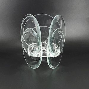 Pairs of clear round glass disks fused to a thick, triangular shaped glass votive holder in center