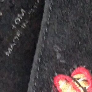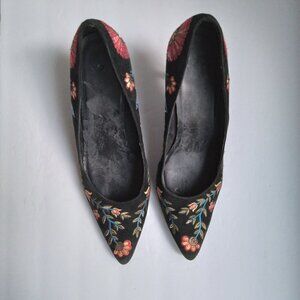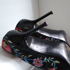 * Black floral embroidered pointy toed pumps on faux suede with 3.25" shiny black spike heels