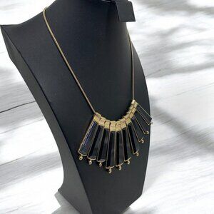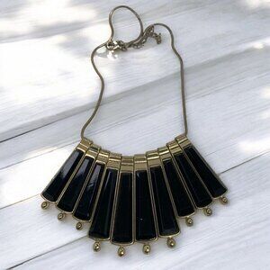 A stunning vintage bib necklace featuring an 18" gold tone snake chain with silver lobster clasp in back and 4" extender. Suspended from the chain is a beautiful fan pendant, comprised of a series of ten individual pendants in gold tone metal and black stone, each ending with a small gold ball. The pendants move independently of each other. The necklace is a real eye catcher and resembles an ancient treasure. Excellent vintage condition.